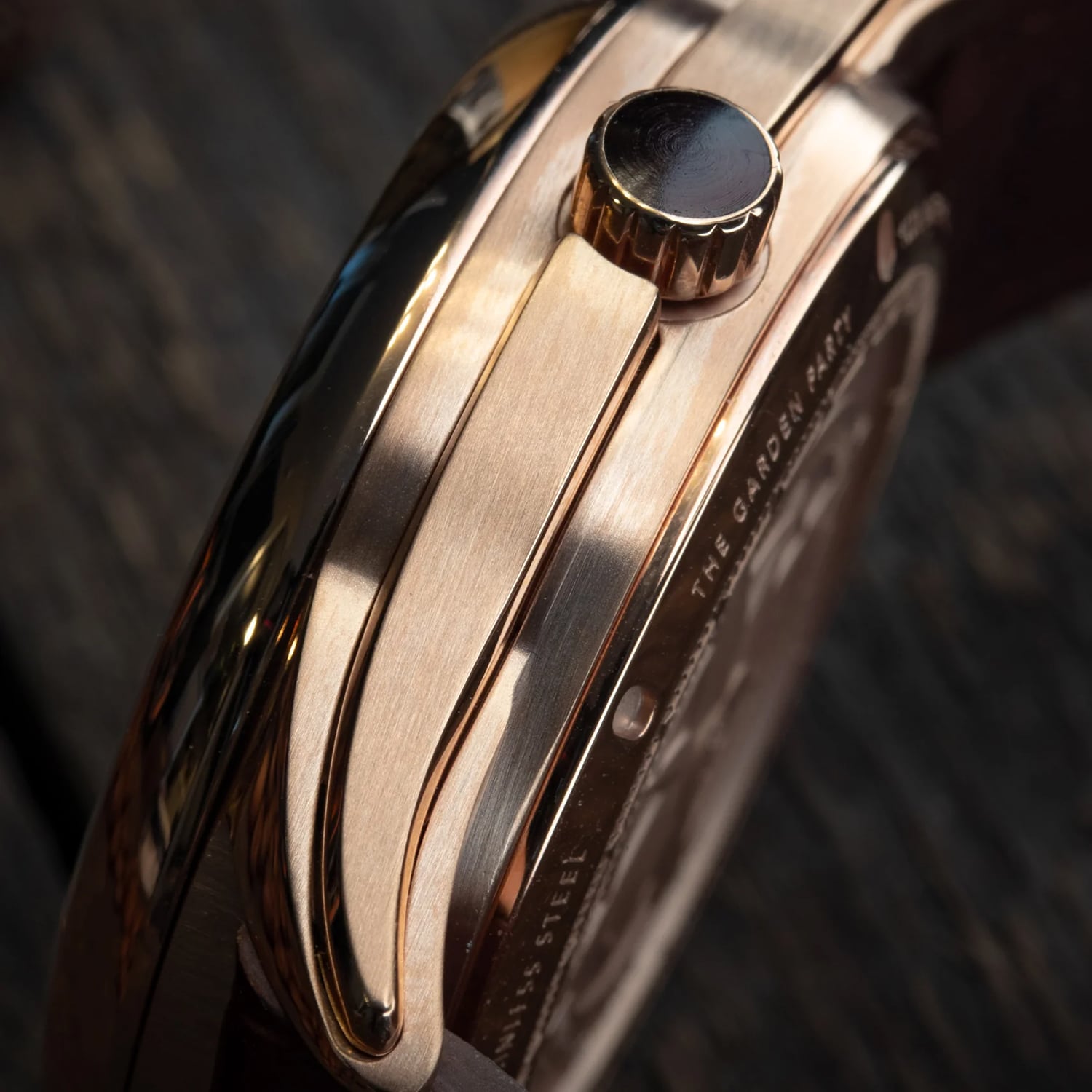 Designet er komplekst men skal harmonere godt så det i tillegg oppleves rent og tydelig. Klokken er ment å gi følelsen av eleganse men på en avslappet måte så den bæres litt godt til hverdag som til fest.