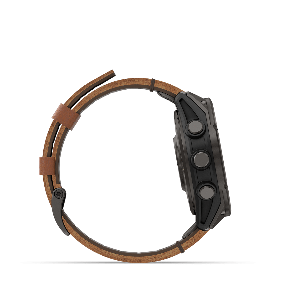 • Robust design med lys 1,4″ (35,56 mm) AMOLED berøringsskjerm, titanbesel, ripebestandig safirlinse og andre premium materialer